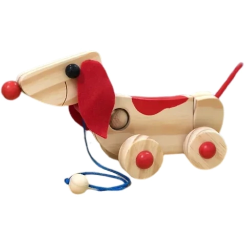 Cachorro salsicha de madeira pinus com rodinhas que balança o rabinho quando puxado pela cordinha.