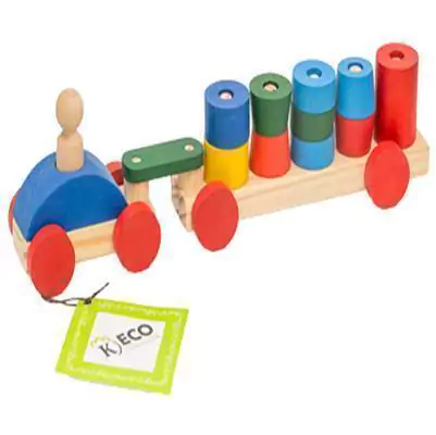 Essa carreta de encaixe é confeccionada em madeira ecologicamente correta e vem com argolas coloridas que se encaixam nos pinos.