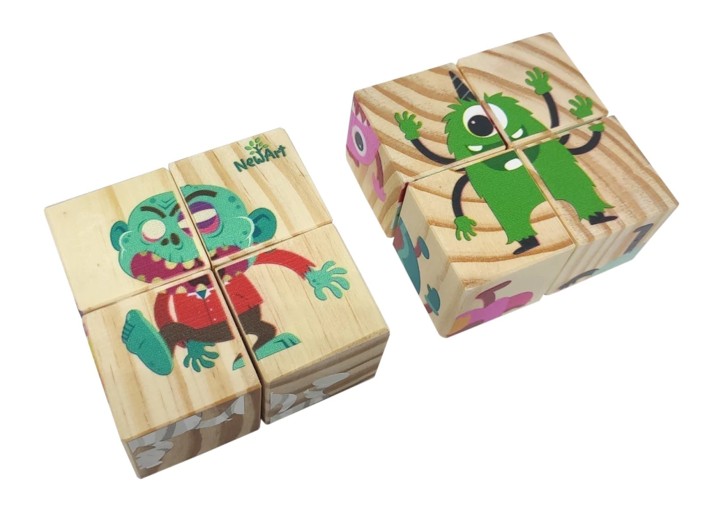 É um conjunto de oito cubos de madeira com doze diferentes desenhos de monstros.